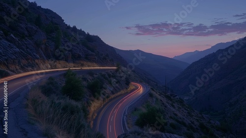 A winding road climbs up the side of a mountain dotted with the glowing trails left behind by vehicles navigating the pass.