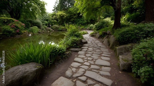 A winding stone pathway meanders through a lush tranquil garden beside a reflective pond