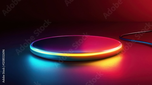 A wireless charging pad with a glowing ring on a dark red backdrop.