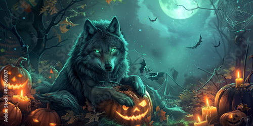 A wolf with glowing green eyes sits amidst a collection of carved pumpkins under a full moon on a spooky Halloween night