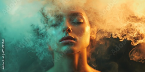 A woman amidst swirling smoke with vibrant colorful lighting.
