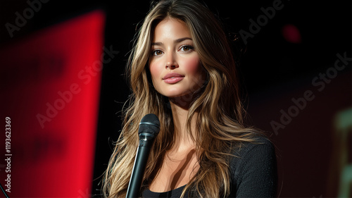 A woman confidently addresses an audience while holding a mic.