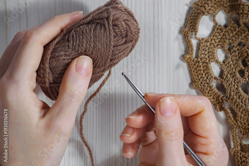 A woman crochets a napkin. Top view, close-up.