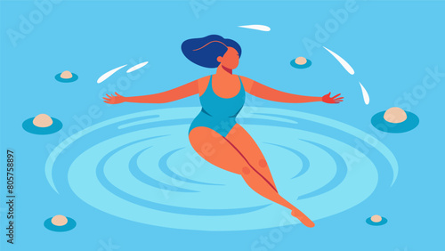 A woman floating on her back and performing arm circles in the warm pool feeling the stress melt away as she focuses on her breathing and gentle. Vector illustration