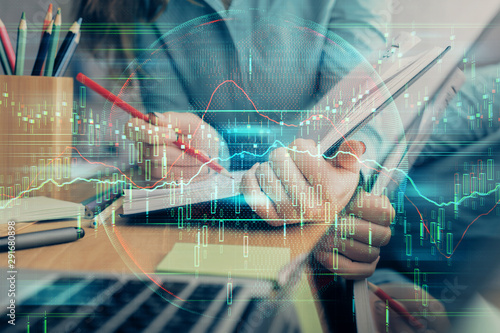 A woman hands writing information about stock market in notepad. Forex chart holograms in front. Concept of research. Multi exposure