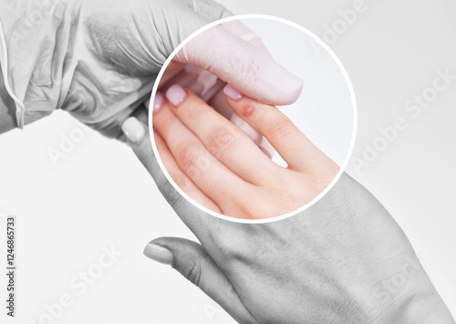A woman has a wart on her little finger. Treatment of warts with liquid nitrogen.