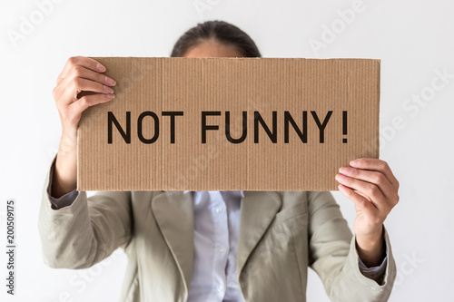A woman holds a banner with the inscription NOT FUNNY