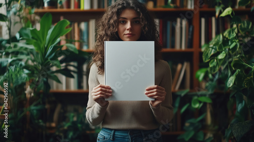 A woman holds an empty white book cover in front of her chest, with books on shelves behind her and green plants to the side.