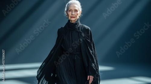 A woman in a black dress is walking down a runway. The dress is long and flowing, and the woman is wearing a scarf. Concept of elegance and sophistication