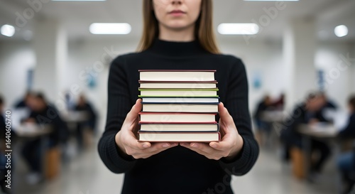 A woman in a black turtleneck holds a stack of books in her hands, in a library or study area with blurred background figures.