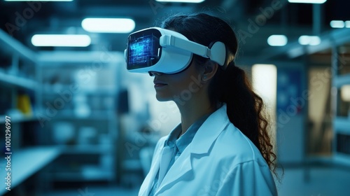 A woman in a lab coat uses a virtual reality headset in a modern research environment.