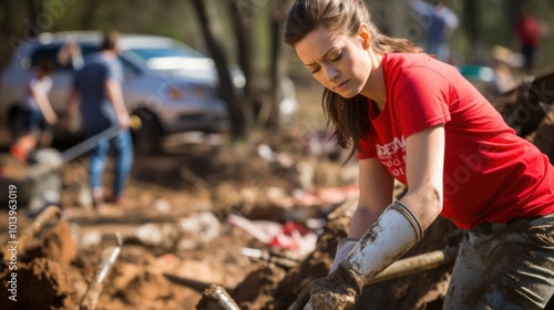 A woman in a red shirt works diligently with a shovel amidst a debris-filled landscape, showcasing resilience and determination.