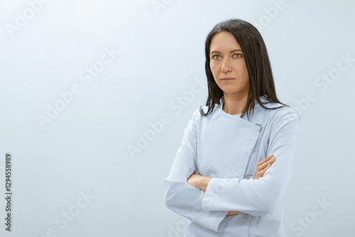 A woman in a uniform making a displeased facial expression, looking dissatisfied.