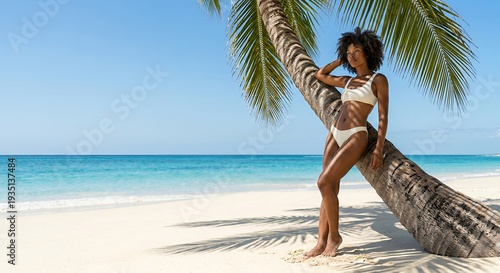 A woman in a white bikini leans against a palm tree on a tropical beach.