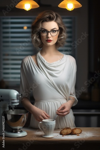 A woman in a white dress gracefully sets the table with elegant tableware, while the wall behind her boasts vibrant art, a steaming kettle and coffee mug beckoning for her attention, as a bowl of fre