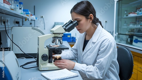 A woman in a white lab coat examines a sample under a microscope, a symbol of scientific discovery and progress.
