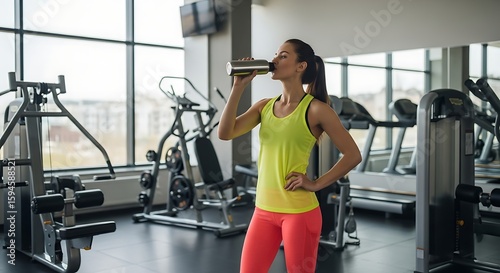 A woman in activewear drinks from a shaker bottle in a modern gym.