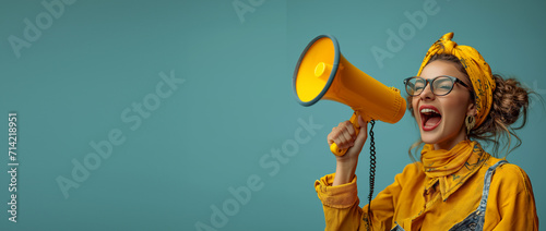a woman in yellow clothes and glasses on a blue background shouts joyfully into a megaphone. studio photo, place for text