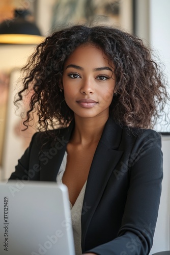 A woman is attending a virtual job interview, focused and prepared. Her home office is quiet professional