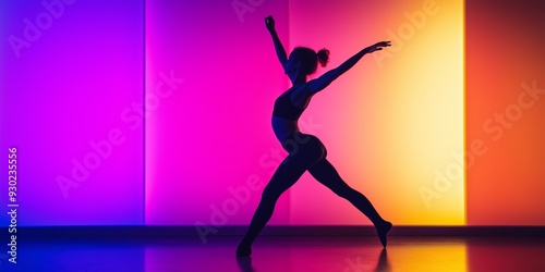 A woman is dancing in front of a colorful wall. Concept of energy and movement, as the woman's body is in motion and the colors of the wall create a dynamic and vibrant atmosphere