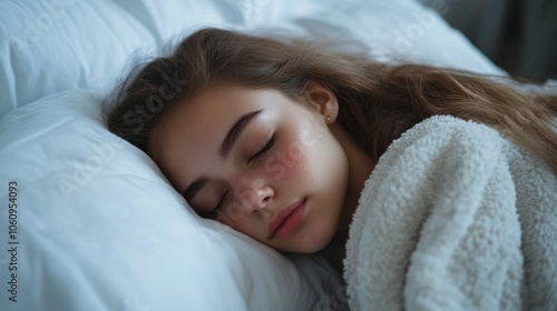 A woman is sleeping on a white pillow with a white blanket. She has dark hair and is wearing a white sweater