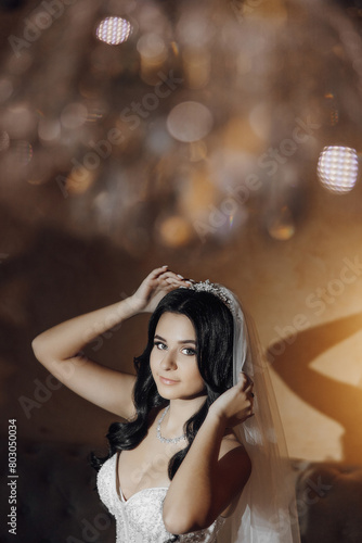 A woman is wearing a white dress and a tiara. She is standing in front of a chandelier