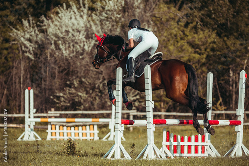 A woman jockey participates in competitions in equestrian sport, jumping.