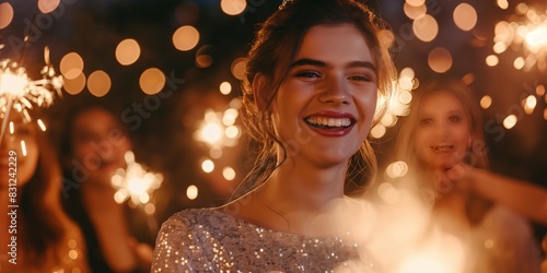 A woman joyfully celebrates with sparklers, surrounded by a smiling crowd in a festive atmosphere. The background is filled with a warm, bokeh effect from lights.