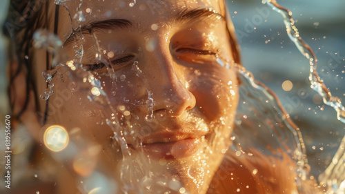 A woman joyfully embraces a splash of water on her face, eyes closed, bathed in warm sunlight, capturing a serene, refreshing summer moment.