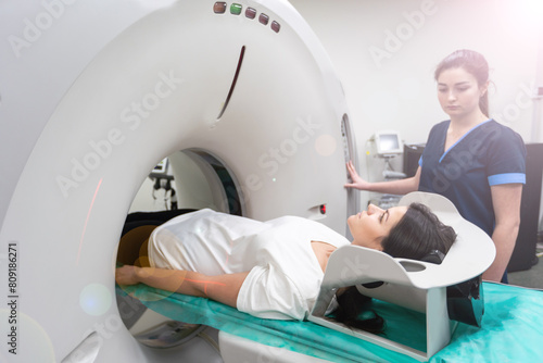 A woman lies on the tomograph table. woman is undergoing computed axial tomography examination in a modern hospital