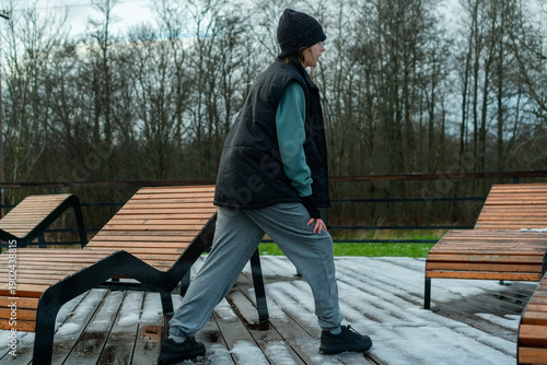 A woman performing side lunges during her outdoor workout routine. Emphasizing the importance of leg exercises for overall physical health and flexibility.