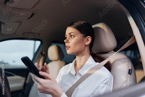 A woman seated in the driver's seat of a car, holding a cell phone and attentively looking at the screen, depicting a moment of focus and interaction with mobile technology in a driving setting