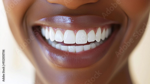 A woman shows her radiant smile, highlighting her perfectly aligned, white teeth against a soft background