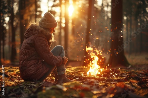 A woman sits alone by a campfire in the woods, the sun setting in the background