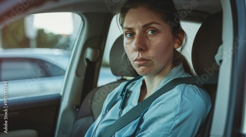 A woman sits in a car, appearing reflective and thoughtful, as the outside world blurs beyond the window, portraying a moment of contemplation.