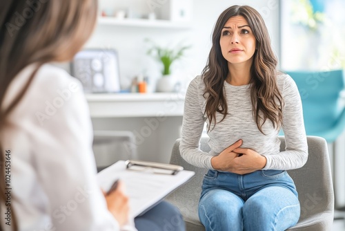 A woman sits in a consultation room, holding her stomach as she explains her symptoms