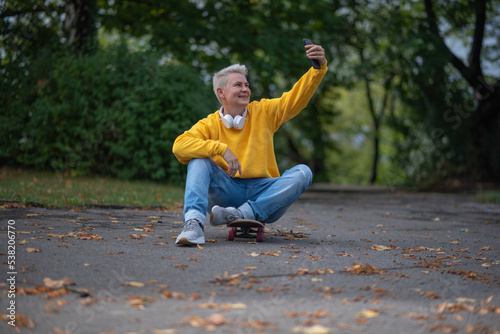A woman sits on a skateboard and looks into her phone and does salfy