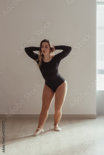 A woman standing in a dance pose in a dance studio, dressed in a dance outfit.
