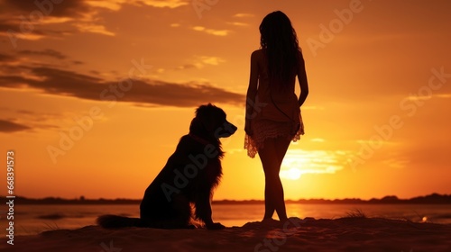 A woman standing next to a dog on a beach