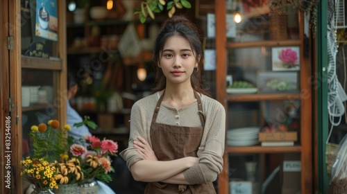 A woman stands at the entrance of her shop, an adult is waiting for customers at a coffee shop, and a successful business owner is wearing an apron