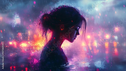 A woman stands in the rain, her silhouette illuminated by colorful lights in the distance. The rain is falling in a soft, ethereal glow.