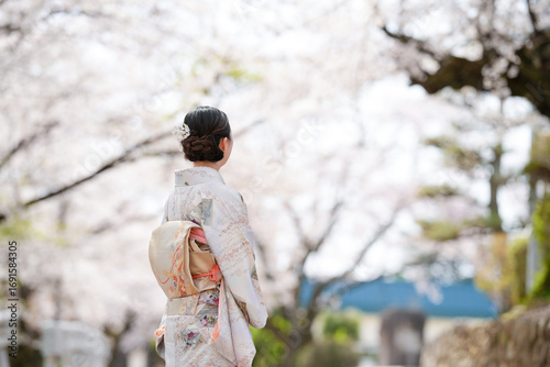 A woman wearing a kimono stands in front of cherry blossoms. The scene is serene and peaceful, with the woman looking out at the trees and the flowers. Concept of calm and tranquility