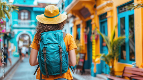 A woman wearing a yellow hat and a blue backpack is walking down a street. The street is lined with colorful buildings and there are several potted plants along the sidewalk. The scene has a lively