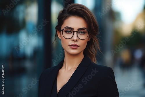 A woman wearing glasses standing in front of a building. Suitable for business concepts