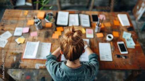 A woman with a bun hairstyle is seen from above working diligently at a wooden table cluttered with papers, stationery, and technological devices, conveying focus and productivity.