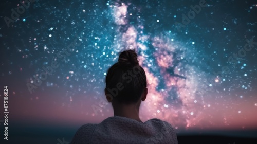 A woman with a bun hairstyle staring up at the glowing Milky Way under a clear, star-filled sky, symbolizing wonder, exploration, and the beauty of the universe.