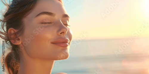 A woman with a smile on her face is standing on a beach. The sun is shining brightly, and the water is calm. The woman is enjoying the beautiful day and the peaceful surroundings