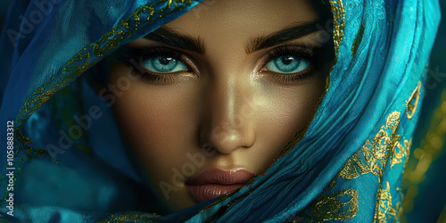 A woman with blue eyes and a blue scarf covering her face
