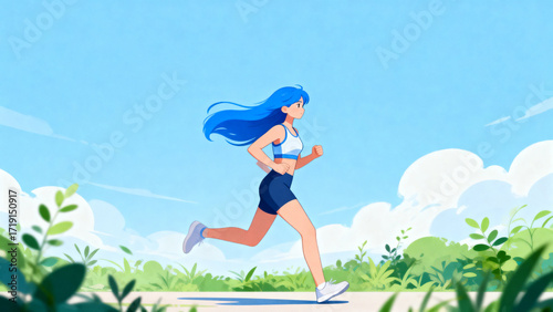 A woman with blue hair running on a path in a sunny outdoor setting