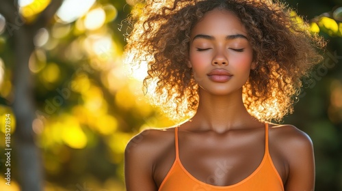 A woman with curly hair and a bright orange tank top is sitting in the sun, looking relaxed and peaceful